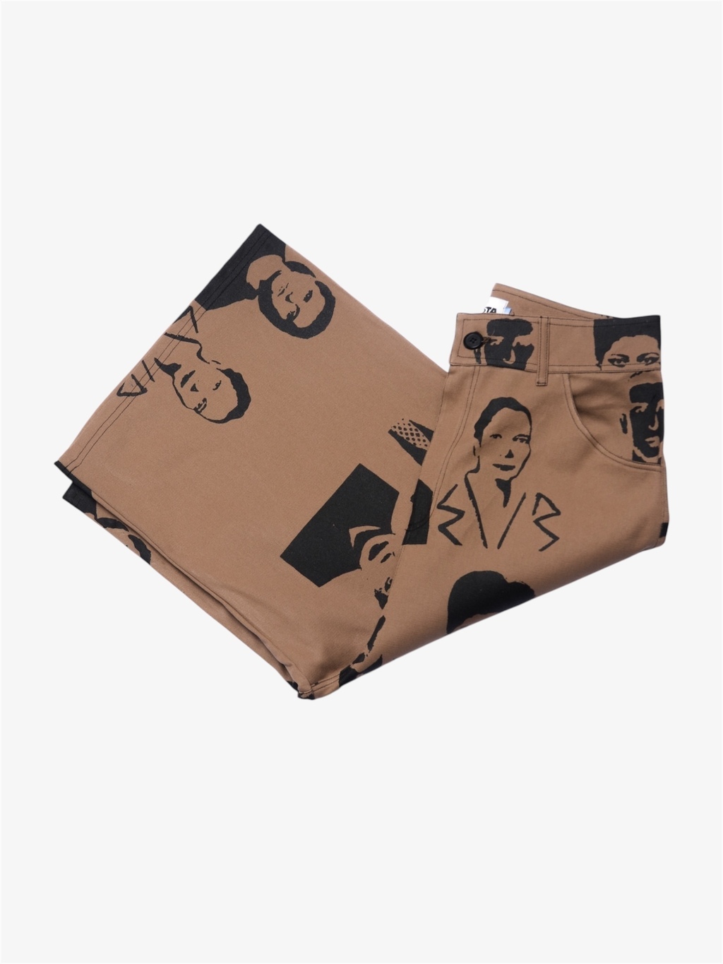 BERMUDA EN GABARDINA ARENA PESADA CON ESTAMPA SERIGRAFICA NEGRA DE ROSTROS DE TRABAJADORES Y TRABAJADORAS DE LA COOPERATIVA INDUSTRIAL TEXTIL ARGENTINA